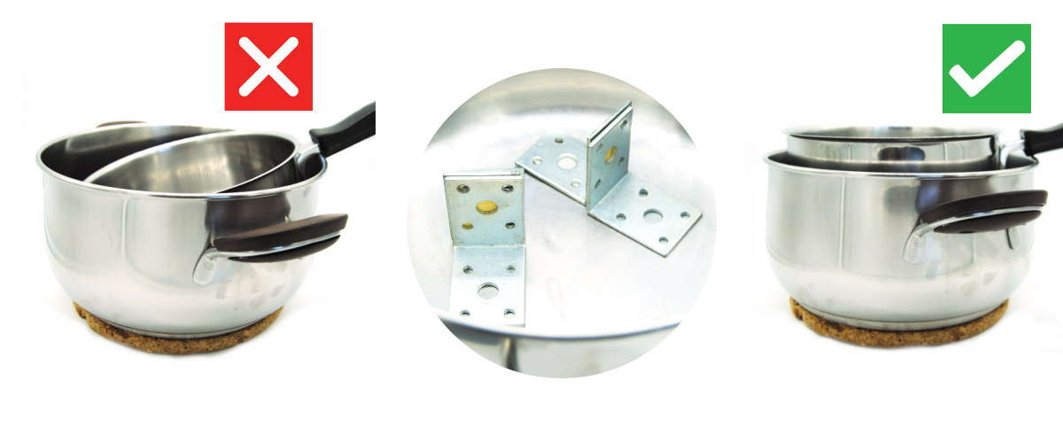 Si votre récipient de fonte peut reposer librement dans le récipient extérieur, vous devrez faire en sorte que leurs fonds soient légèrement séparés, autrement vous perdrez le bénéfice du bain-marie. Si c'est le cas, vous pouvez également utiliser des équerres métalliques, mais choisissez-les nettement plus petites: un espace d'un centimètre entre les deux récipients est suffisant.