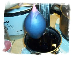 Néanmoins, il n'est pas impossible que le ballon éclate tout de même, envoyant de la paraffine chaude et de l'eau éclabousser dans tous les sens. Lors des premiers trempages, je vous recommande de porter des gants en caoutchouc et des lunettes de protection (ces deux objets sont disponibles dans les grandes surfaces de bricolage).