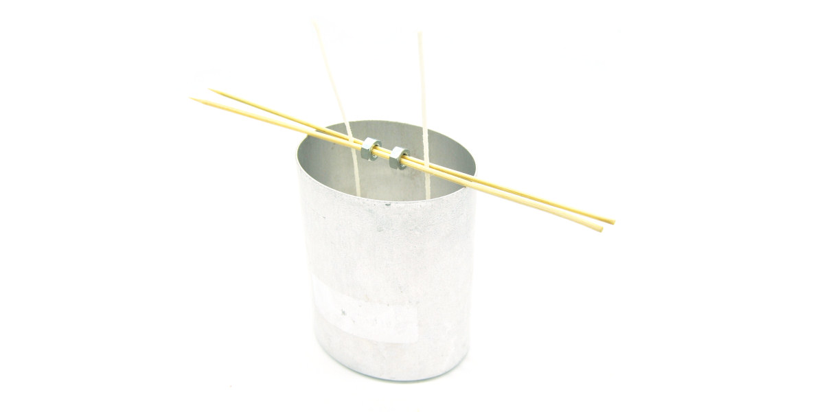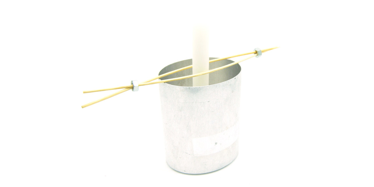 La configuration ci-dessus est idéale pour les bougies à deux mèches. Faites glisser les deux écrous vers le centre du moule ou du conteneur et coincez une mèche de chaque côté.
