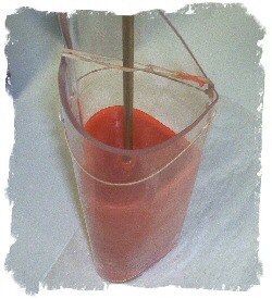 Mettez donc votre paraffine à fondre au bain-marie. Une fois celle-ci entièrement fondue et sa température approchant les 85°C, ajoutez-y la stéarine. Laissez celle-ci se dissoudre entièrement et remuez bien pour mêler parfaitement les deux ingrédients. A ce stade, vous pouvez ajouter le colorant de votre choix.