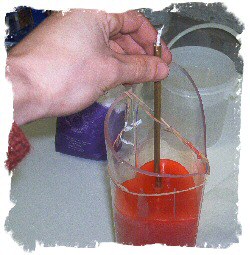 Pour commencer, coupez un morceau de mèche environ 5 centimètres plus long que votre récipient est haut. A son extrémité, pincez une attache à mèche afin de pouvoir facilement la fixer au fond du récipient. Attention: ne collez pas l'attache au fond du récipient comme vous le feriez pour une bougie conteneur, vous ne pourriez plus démouler la bougie une fois celle-ci terminée. En lieu et place de la colle, plaquez sous l'attache une petite boulette de mastic d'étanchéité, comme illustré.