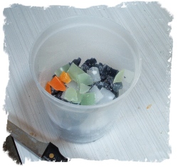 Les toutes petites quantités, comme par exemple les coins obtenus en réalisant des chunks (voir plus loin), des rognures ou fontes diverses, des coulures récupérées sur le papier sulfurisé peuvent être simplement entreposées dans un récipient (comme sur la photo ci-contre) et utilisées plus tard.